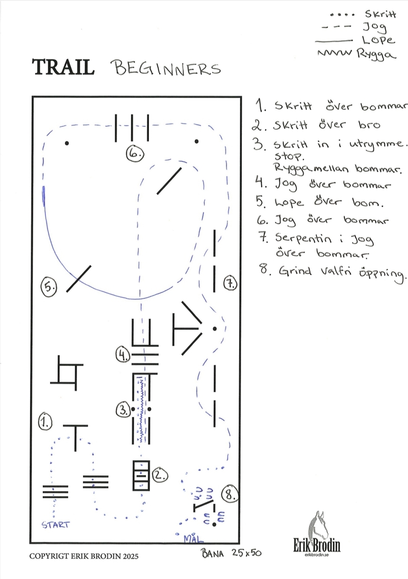 I trail beg och w&t får man först gå banan med domare och sen gå 1 varv ytterkant på banan med häst vid behov.