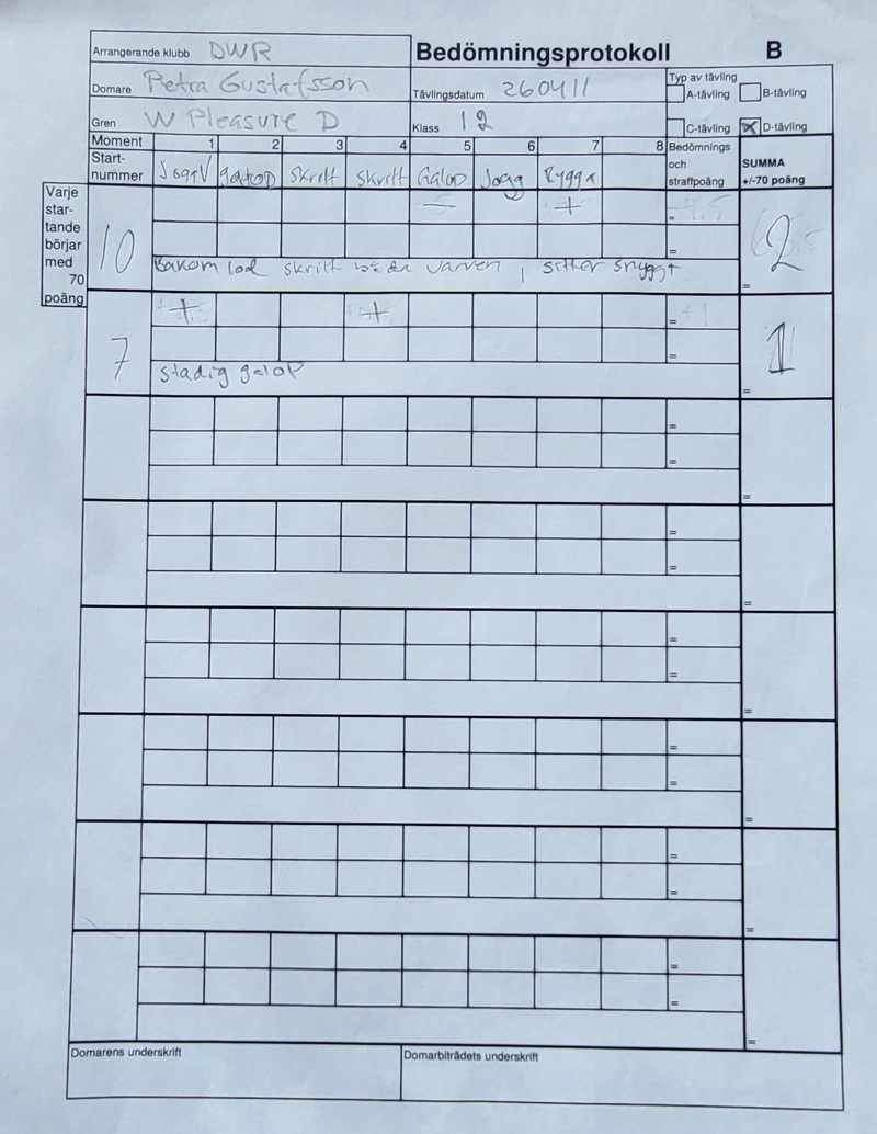 Undantag: På D-nivå är engelsk utrustning tillåten (denna dag). Varje häst får starta flera gånger i samma klass med olika ryttare. WH och WP är D- och C-nivå hopslagna och man får rida med både tränsbett och stångbett.
