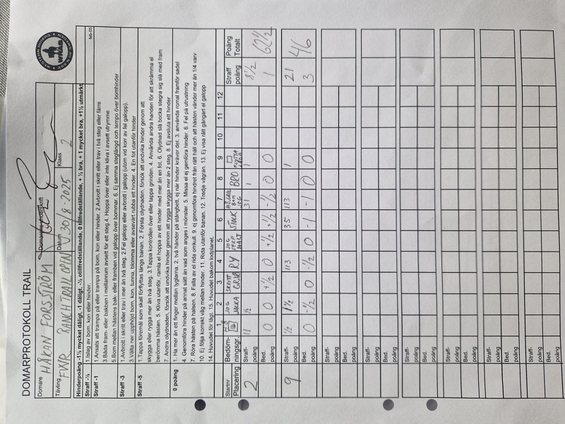 Domare: Håkan Forsström Tävlingsledare: Susanne Mulder Första start kl.09.00 - Det finns ett begränsat antal rasthagar att hyra under dagen, dessa går i första hand till de som både tävlar och är funktionärer, efter det är det först till kvarn. Önskar man en rasthage är man välkommen att höra av sig till Linn på 0702266733. - Efteranmälningsavgift 200kr, efter den 25/8 (gäller ej om man vill ändra eller lägga till klass som ett redan anmält ekipage) - Minst två startande i open/KM klassen för att den ska bli av. - Rosetter och sponsrade priser tilldelas samt KM-pokaler till klubbmedlem (pokalerna tilldelas på årsmötet) - Prova på tidsgrenar kommer vara tillgängligt sist på dagen (dessa utom tävlan) - För återbetalning av startavgift krävs uppvisande av veterinärintyg/läkarintyg senast den 7 september. 75% av startavgiften betalas då tillbaka. - WRAS regelbok. Undantag görs för utrustning i skritt och trav klasserna, dock är det en hand som gäller vid ridning med stångbett. I Longe Line gäller AQHAs regelbok. - I skritt och trav klasserna är leadline tillåtet, dock ej i pleasure och horsemanship. Kom väl förberedd genom att läsa infon som finns i proppen via länken till vänster. Lunch beräknas efter klass 5 Trail in hand. (kan komma att ändras)